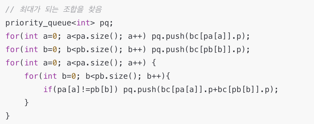 💡 세번 째 for문 : a, b 둘다 접근 가능한 bc → a와 b가 같은 bc를 사용해서는 안됨