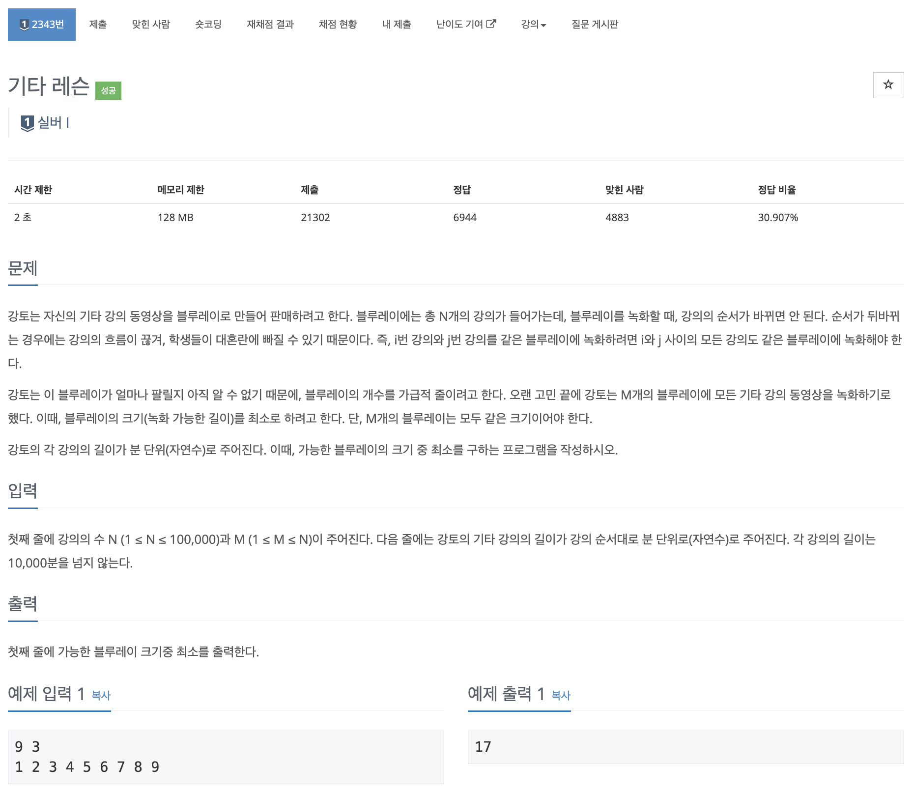 문제 바로가기> BOJ 2343번: 기타 레슨
