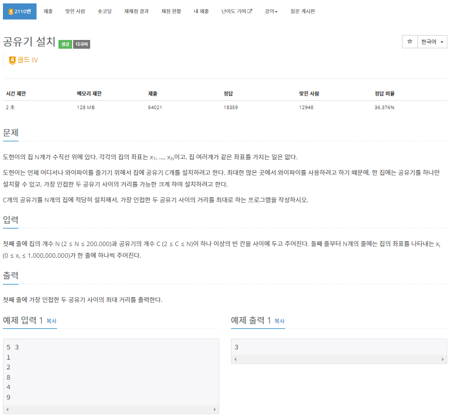 문제 바로가기> BOJ 2110번: 공유기 설치