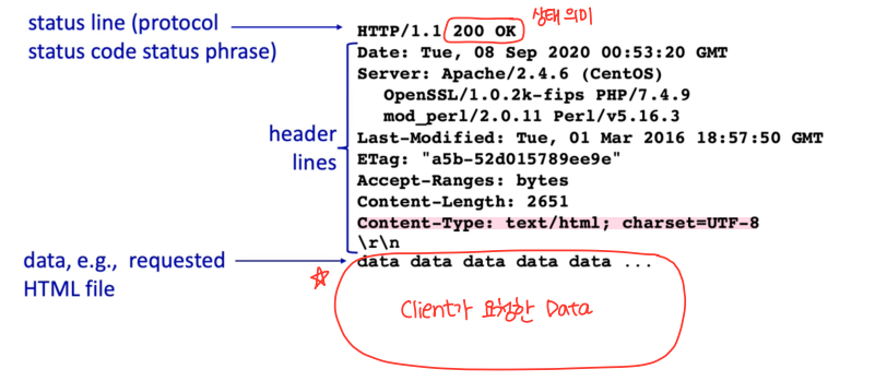 💡 HTTP 통신 1) 클라이언트는 서버에 대한 TCP connection(port 80)을 열어 놓음 2) 서버는 클라이언트로부터 TCP커넥션을 받음 3) 웹(서버)과 브라우저(클라이언트)는 HTTP메세지를 교환함 4) TCP커넥션을 닫음