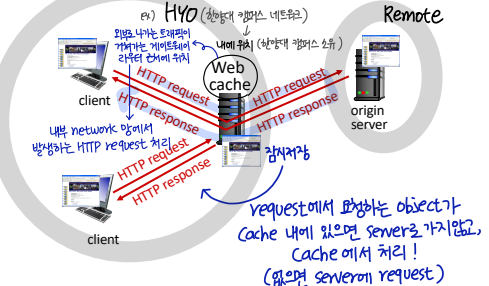 클라이언트가 서버에 직접 web object를 요청하는게 아니라 web cache를 통해 요청