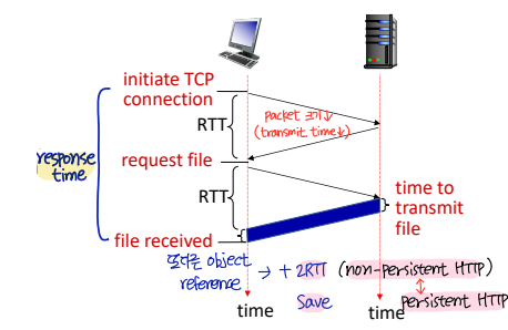 1) Non-persistent HTTP : 하나의 object 당 한 번의 TCP connection 수립 → response time : 2RTT + file transmission time