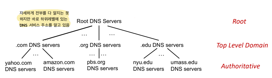 💡 Root DNS Server : TLD 서버에 대한 정보만 가지고 있음 💡 Top-Level Domain (TLD) servers : 루트 노드와 인접해 있는 최상위 도메인 💡 authoritative DNS servers : 최종적인 hostname과 IP 주소를 보유