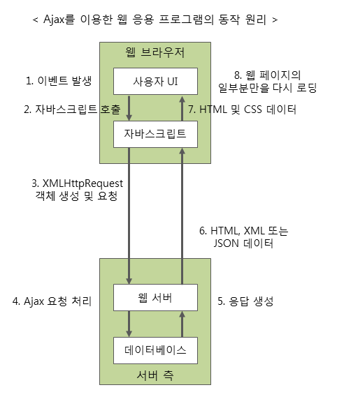 - Ajax를 적용하면 event 발생시 서버에서 요청을 처리한 후 Text, XML 또는 JSON으로 응답