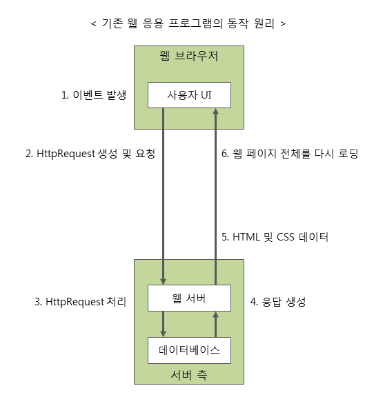 - client(Browser)는 응답 data를 이용하여 화면 전환없이 현재 페이지에서 동적으로 화면을 재구성