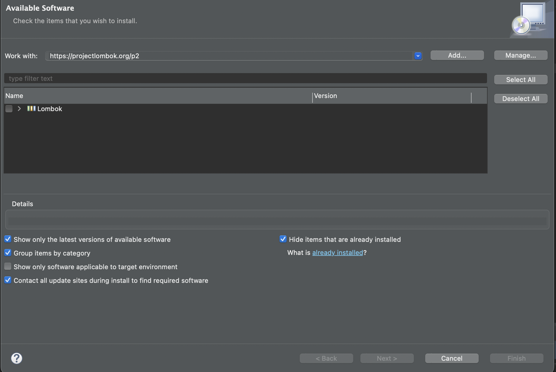 → 검색창에서 https://projectlombok.org/p2 검색/설치 후 restart now