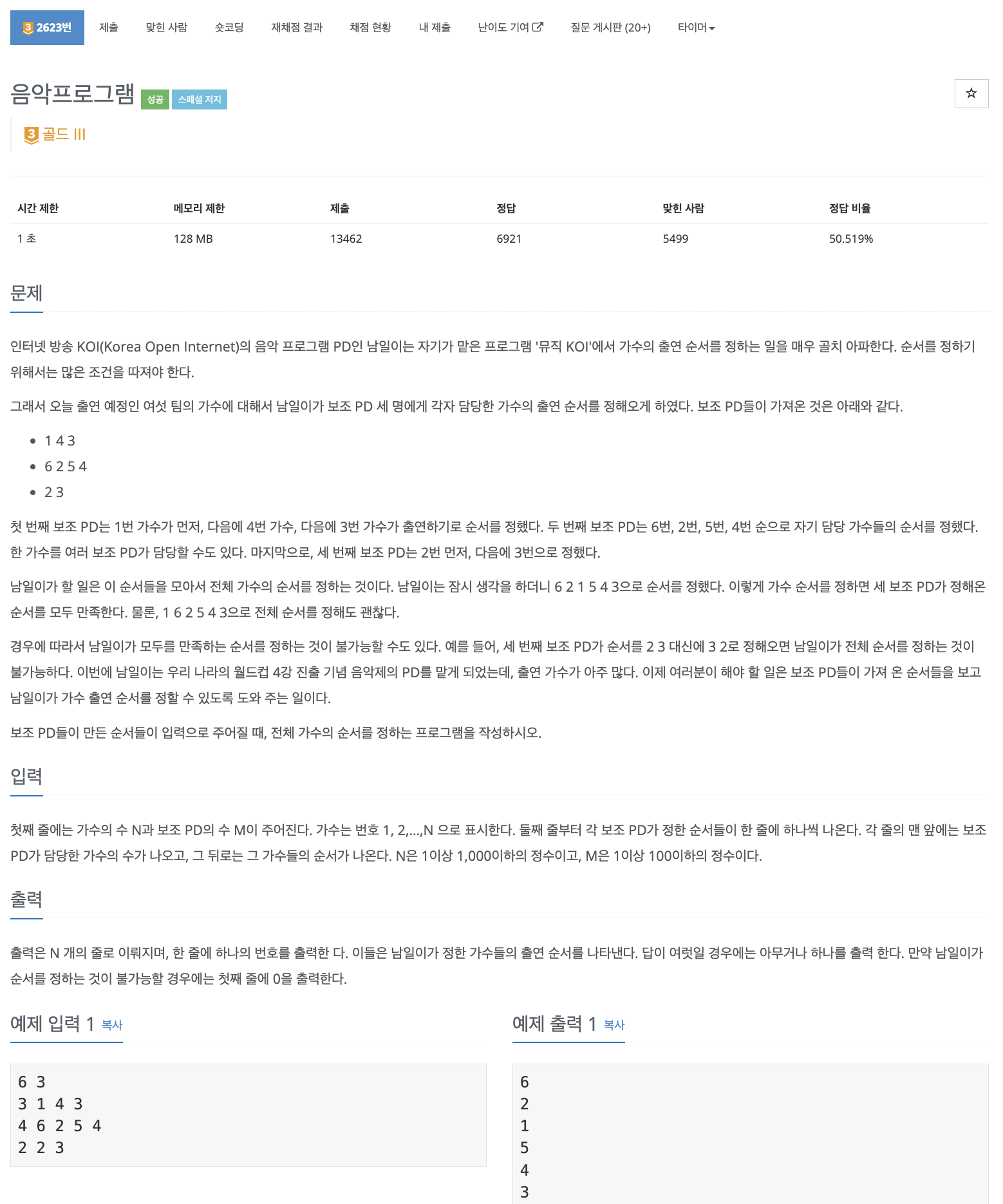 첫째 줄에는 가수의 수 N과 보조 PD의 수 M이 주어진다. 가수는 번호 1, 2,…,N 으로 표시한다. 둘째 줄부터 각 보조 PD가 정한 순서들이 한 줄에 하나씩 나온다. 각 줄의 맨 앞에는 보조 PD가 담당한