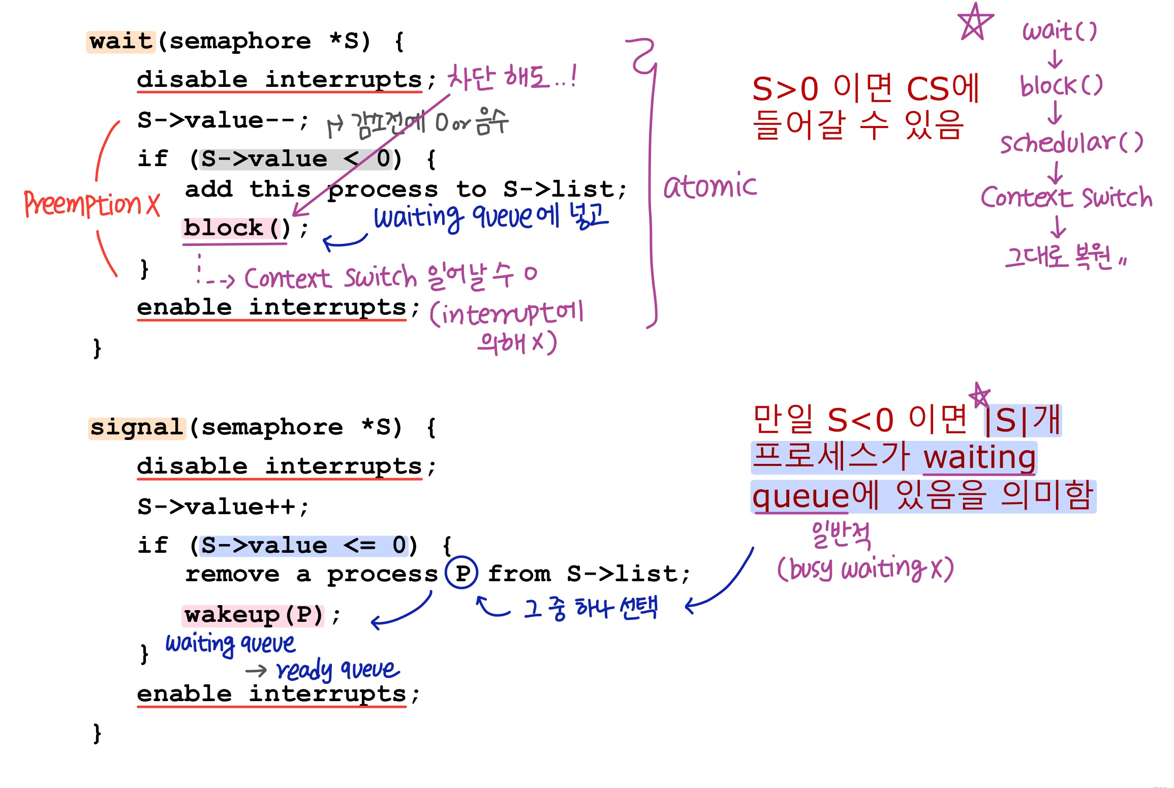* 단일 CPU에서는 interrupt disable을 통해 wait()와 signal()의 원자성을 구현할 수 있다.