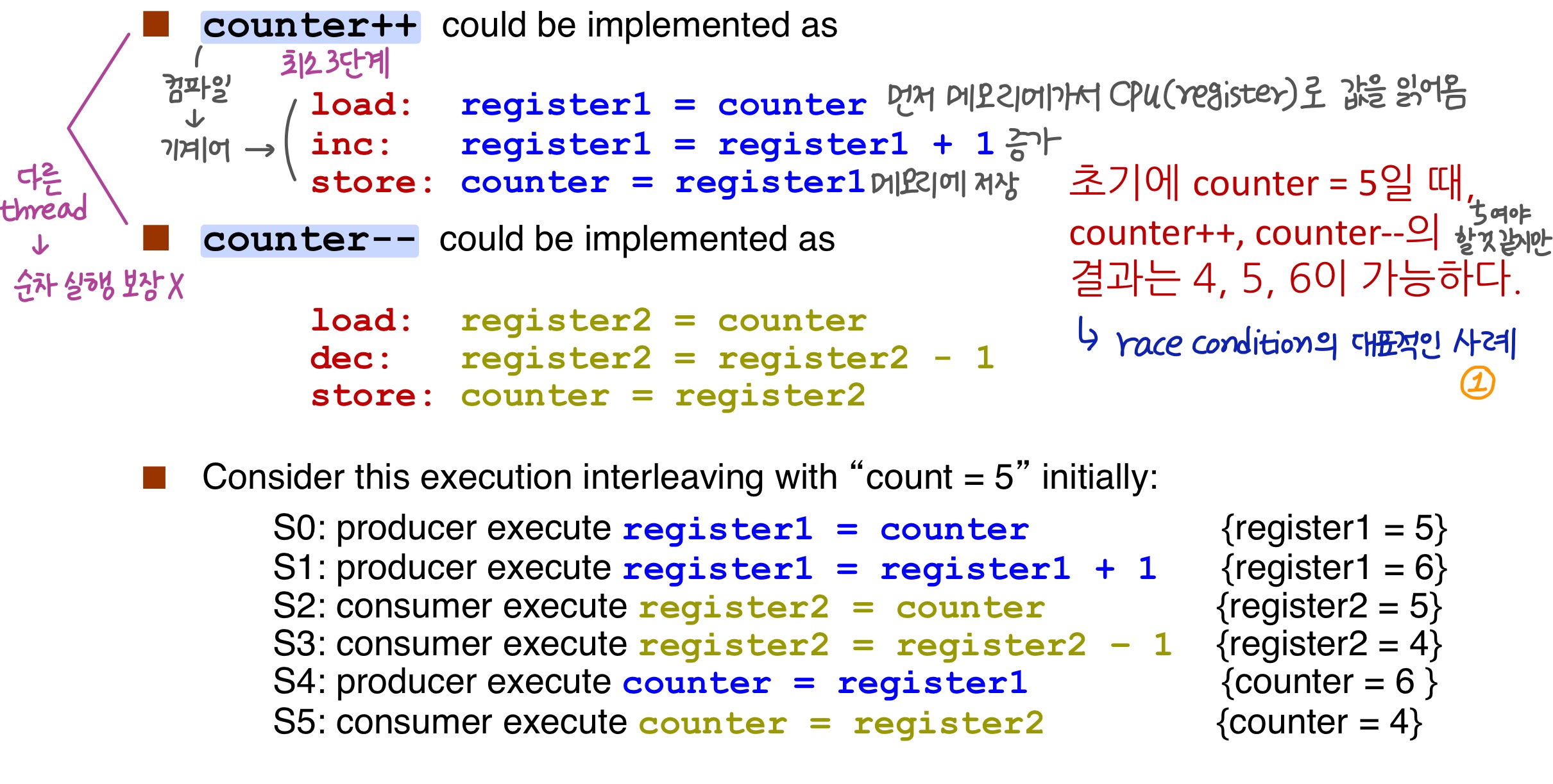 - Race condition을 막고, 일관성을 유지하기 위해 협력 프로세스 간의 실행 순서를 정해주는 동기화가 필요