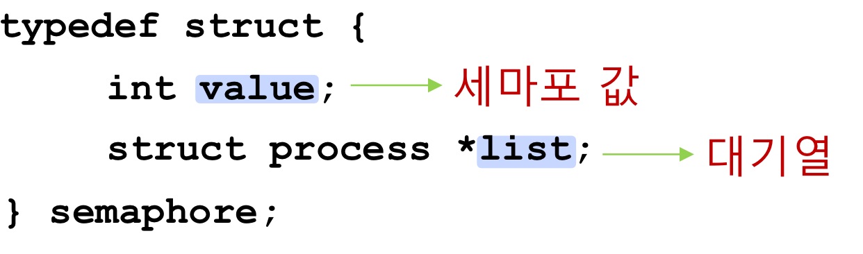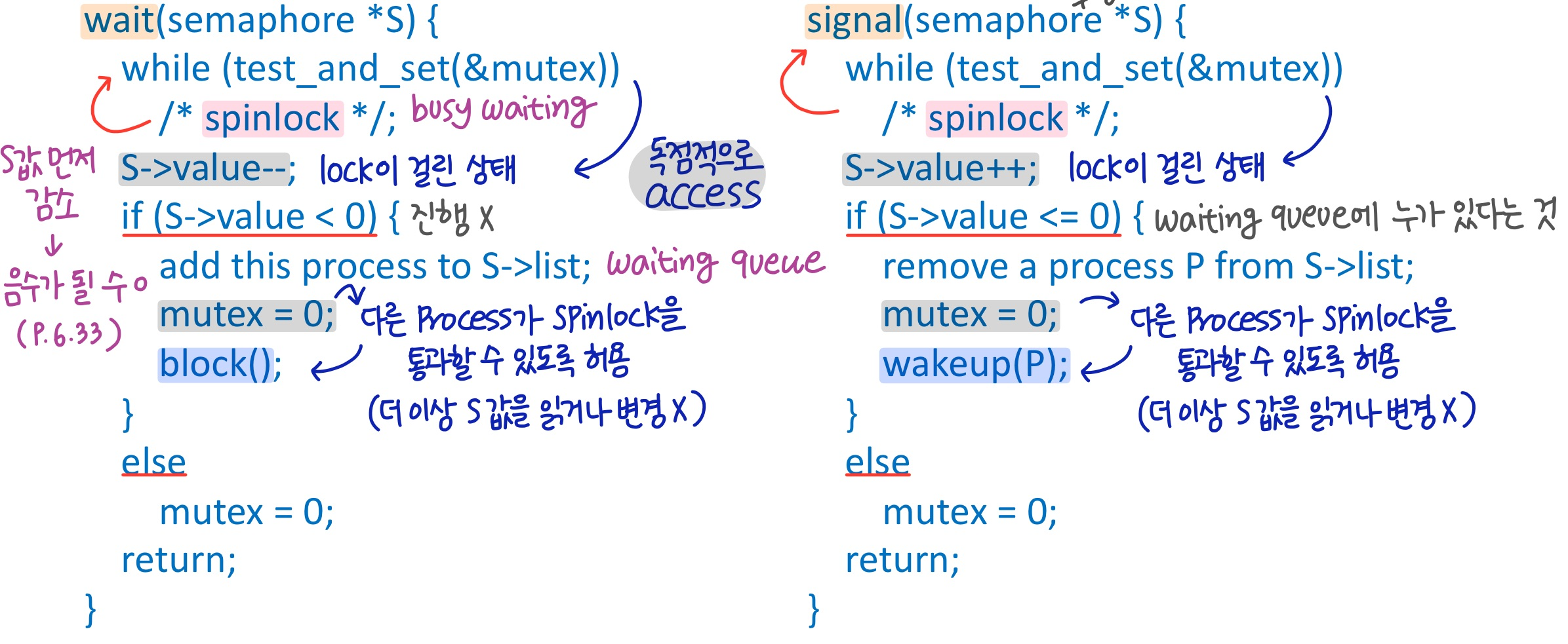 - Critical Section 진입에 실패한 프로세스는 Block된 뒤, Critical Section에 자리가 날 때 다시 깨우는 방식 사용