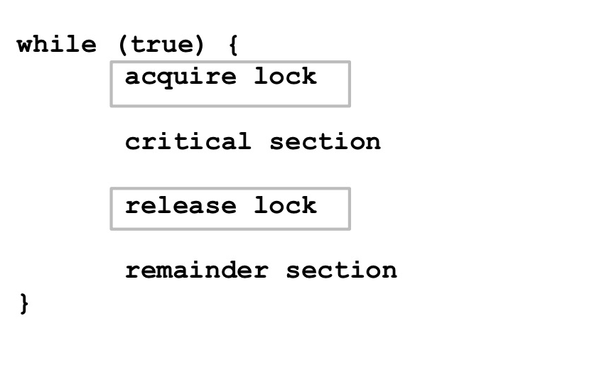 - Critical Section에 진입할 때 프로세스는 Lock을 걸고, 빠져나올 때 Lock을 해제하여 동시 접근을 막음