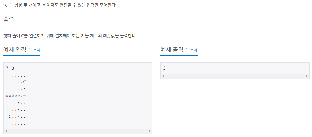 크기가 1×1인 정사각형으로 나누어진 W×H 크기의 지도가 있다. 지도의 각 칸은 빈 칸이거나 벽이며, 두 칸은 'C'로 표시되어 있는 칸이다. 'C'로 표시되어 있는 두 칸을 레이저로 통신하기 위해서