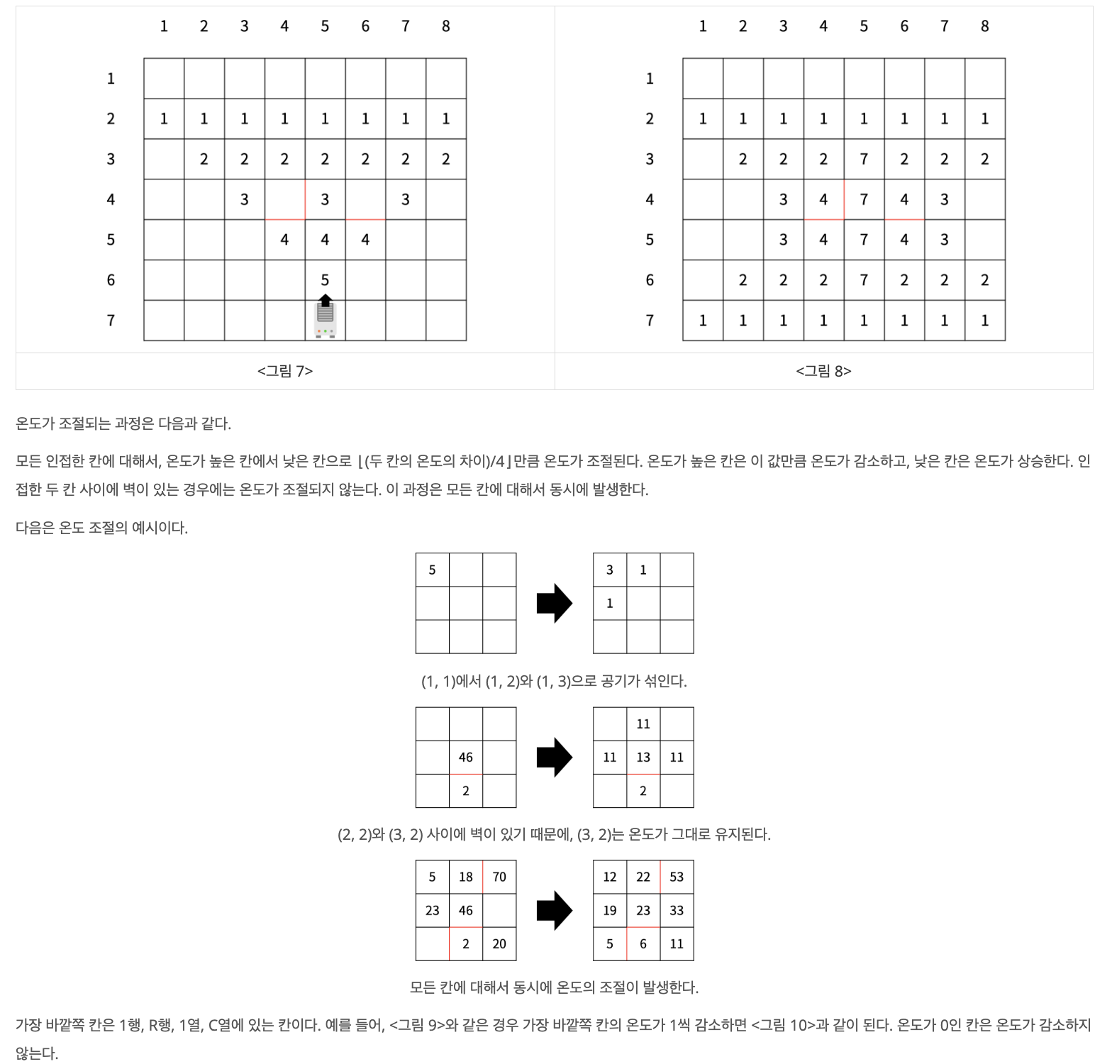 유난히 추운 날씨가 예상되는 이번 겨울을 대비하기 위해 구사과는 온풍기를 설치하려고 한다. 온풍기의 성능을 테스트하기 위해 구사과는 집을 크기가 R×C인 격자판으로 나타냈고, 1×1 크기