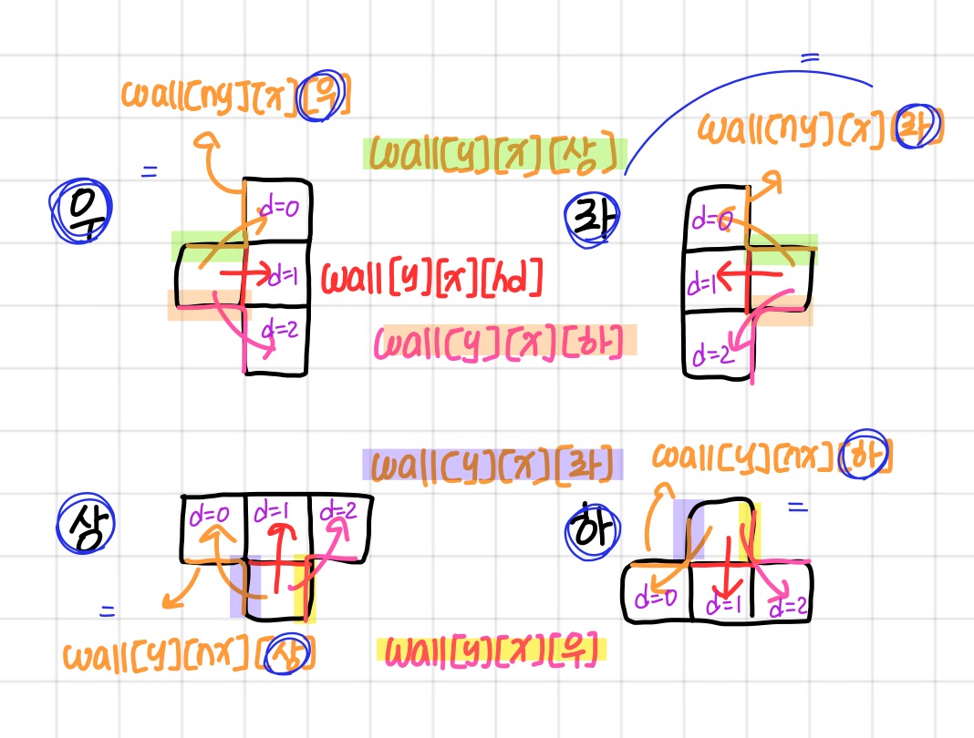 벽은 4차원 배열을 이용해서 그 정보를 저장해주었다!! (코드 input 함수 참조)