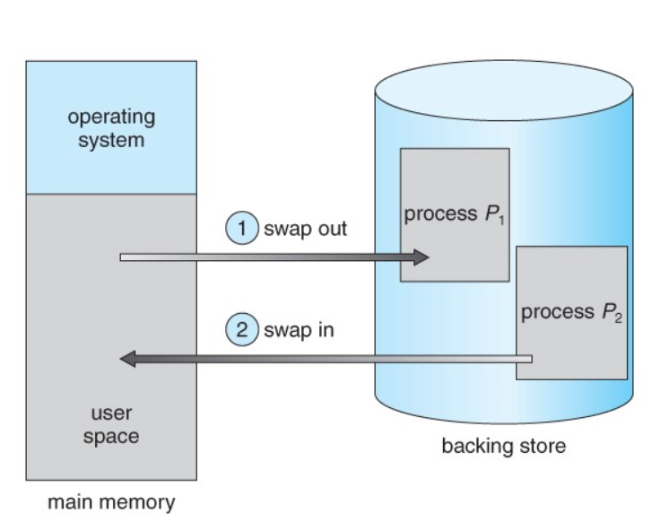- 메모리에 할당된 프로세스를 일시적으로 디스크로 옮겨놓고, 그 자리에 다른 프로세스를 올리는 방식