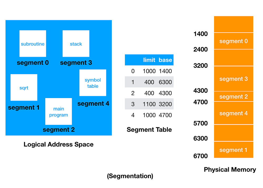 - 세그먼트 번호 + offset 으로 주소 표현 (물리적 메모리에도 세그먼트 번호 + offset으로 매핑되어 저장)