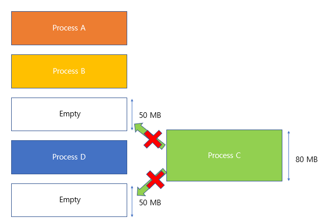 💡 가변적인 크기라는 단점이 있어 여러번의 Swapping이 일어나면 외부 단편화 문제 발생