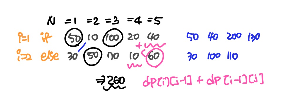 dp[i][j-1] + dp[1][j]가 dp[2][j] 보다 작은 경우 dp[1][j-2] + dp[2][j]를 해주는 것이 최대값이 된다. 이를 i가 1인 경우와 2인 경우로 나누어 각각의 위치에서 스티커의 점수를 더하여 얻을 수 있는 최대값을 구해주었다!
