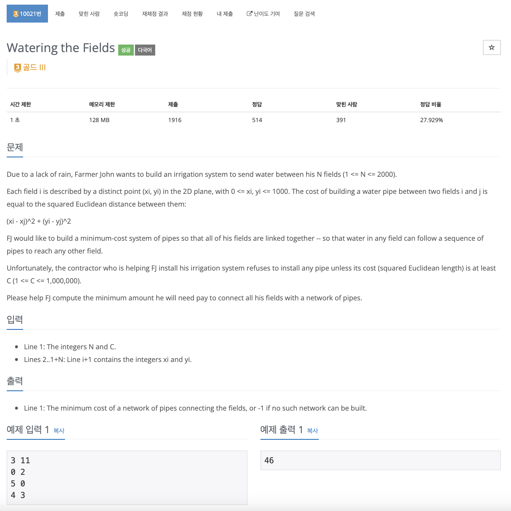 문제 바로가기 > BOJ 10021번: Watering the Fields
