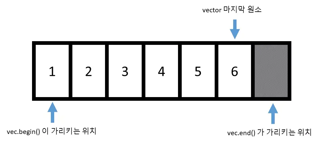 - vector 의 경우 반복자를 얻기 위해서는 begin() 함수와 end() 함수를 사용