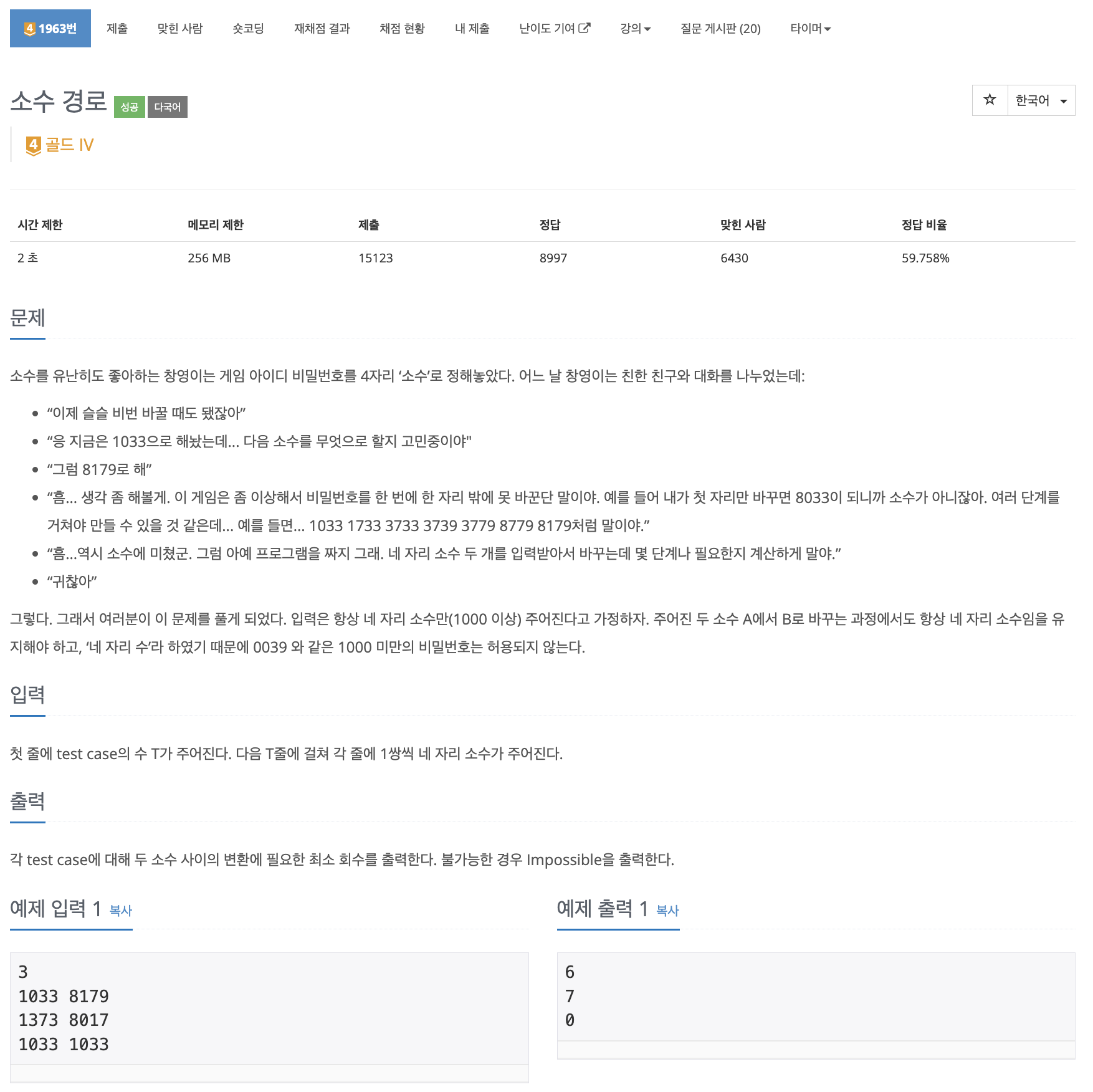 두 소수 사이의 변환에 필요한 최소 회수를 구하는 것이므로 bfs를 이용하여 문제를 해결해주었다.