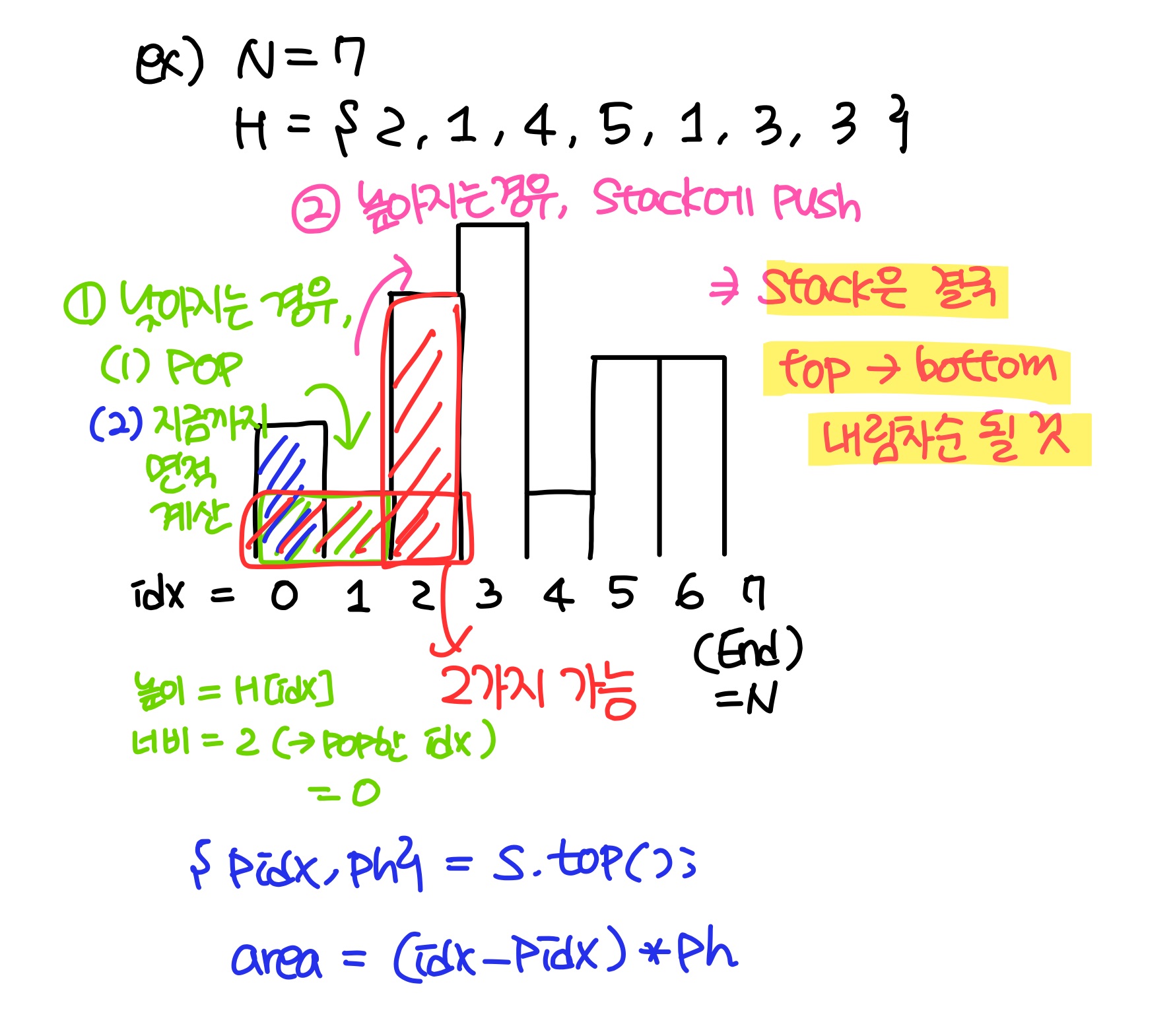 while(!s.empty() && (idx == N || s.top().h > H[idx])){ // 히스토그램 끝 처리 및 낮아지는 경우