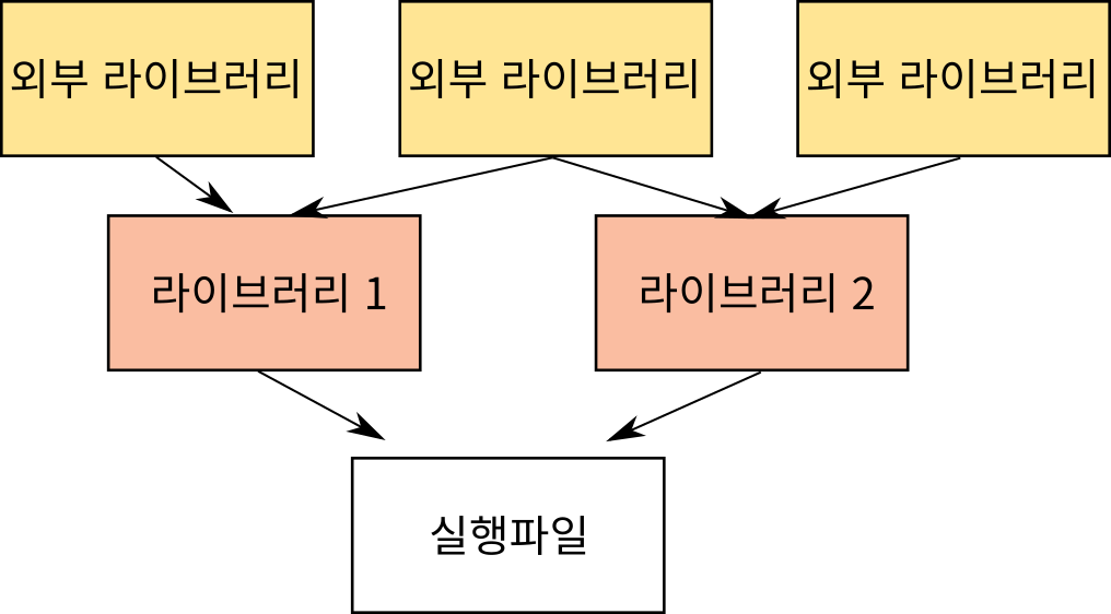 - 라이브러리로 쪼개서 관리하면, 바뀌지 않은 부분은 컴파일 하지 않아도 되서 (링킹만 하면 됨) 개발 속도가 빠름