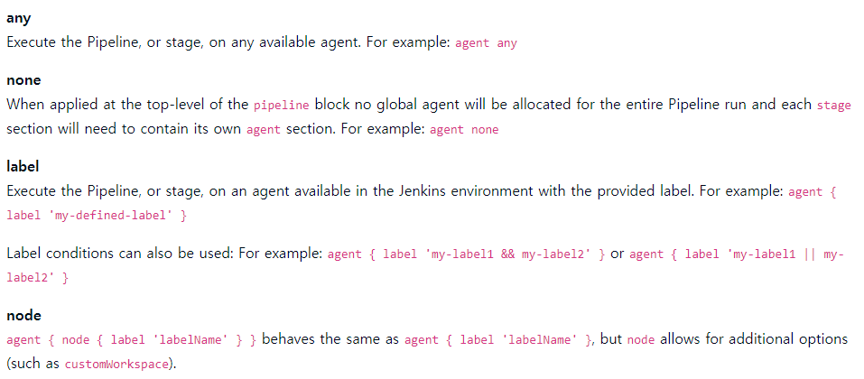 Jenkins pipeline script에서 다음과 같이 내가 만든 agent만 사용하도록 설정할 수 있다.