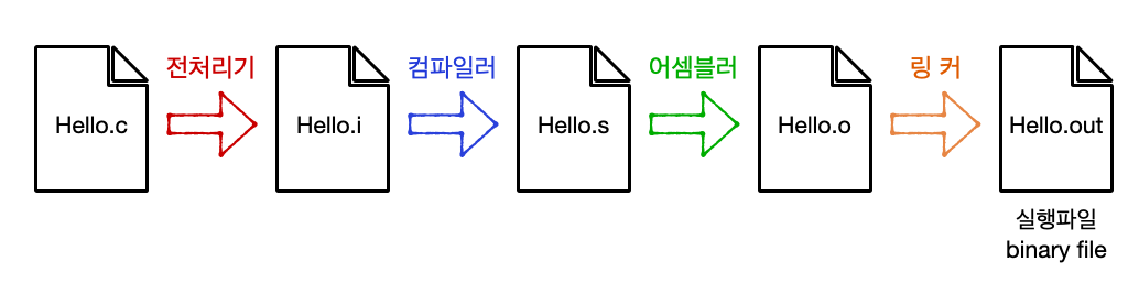 - 전처리 : 헤더파일 혹은 매크로를 치환하여 .i 파일로 저장 (#include, #define 등)