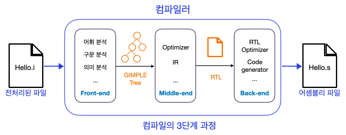 - 컴파일 : 저수준의 언어인 어셈블리어로 컴파일 후 .s 파일로 저장 (ex. c++ -> 어셈블리어)