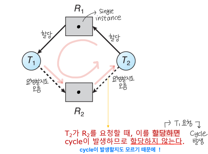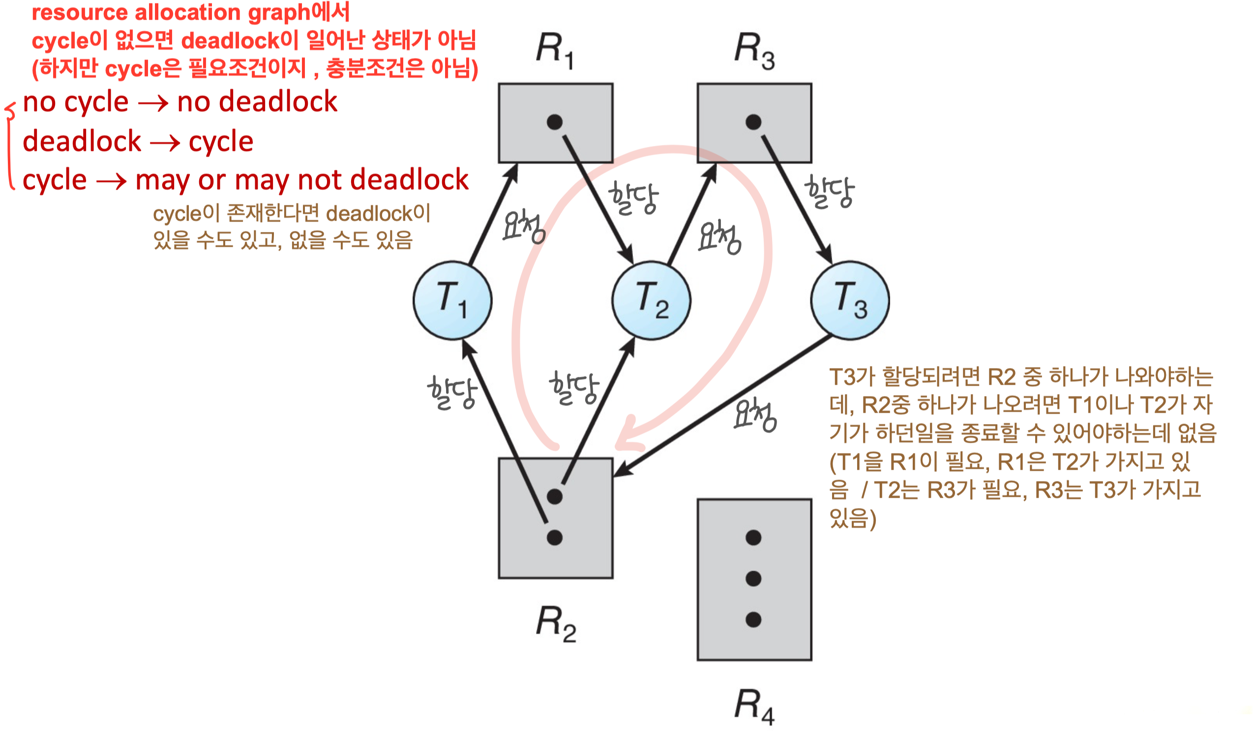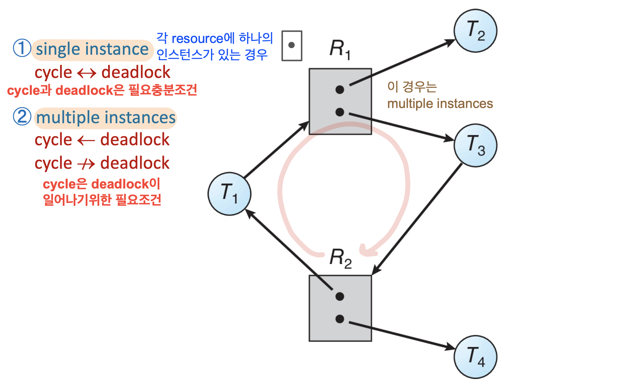 - multiple instances : cycle은 deadlock이 일어나기위한 필요조건