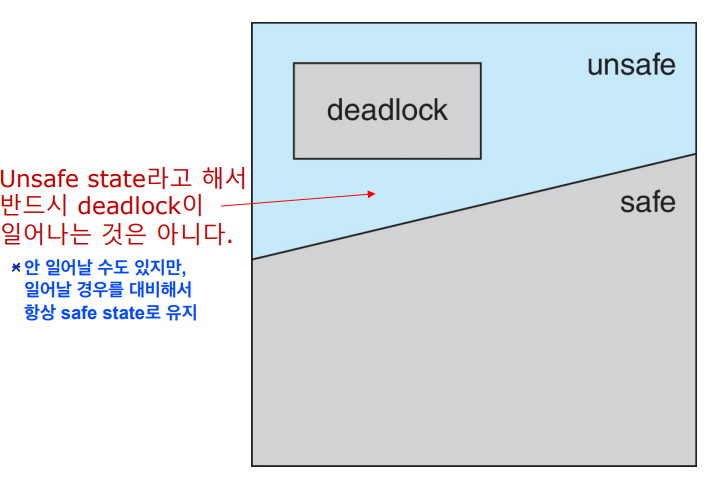 - unsafe state → possibility of deadlock (어쩌면 deadlock이 발생할 수도 있음)