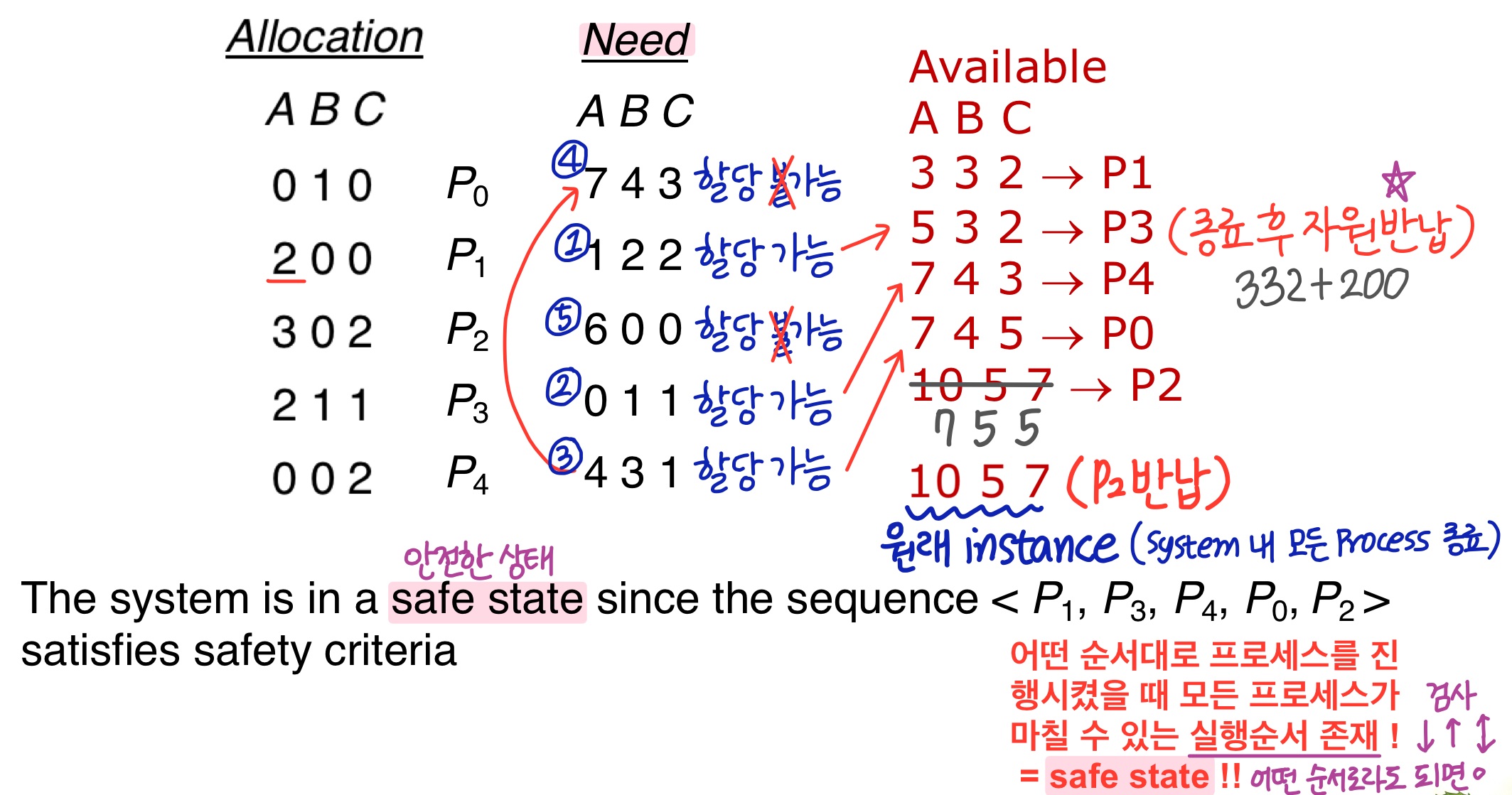 : 어떤 스레드에 resource 요청을 허용해도, 그 시스템이 안전한 상태가 된다면 허용하는 알고리즘