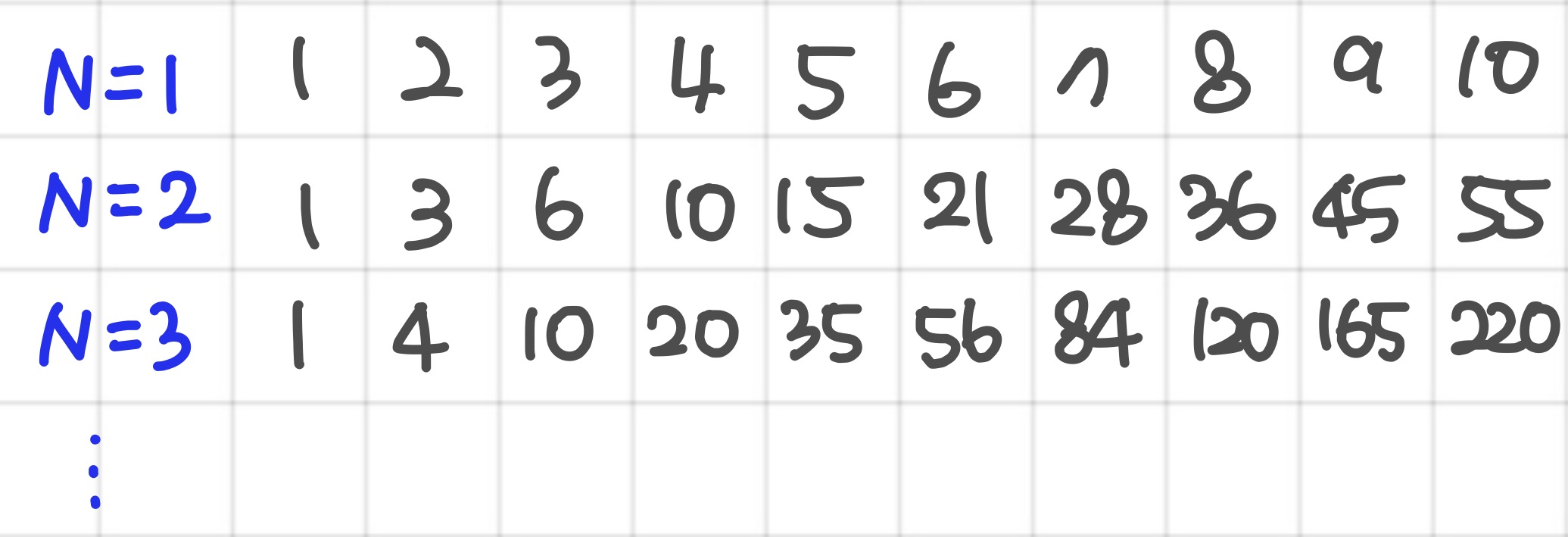 아래와 같은 규칙을 가지므로, 점화식이 dp[i][j] = (dp[i][j-1] + dp[i-1][j])%DIV 이다!