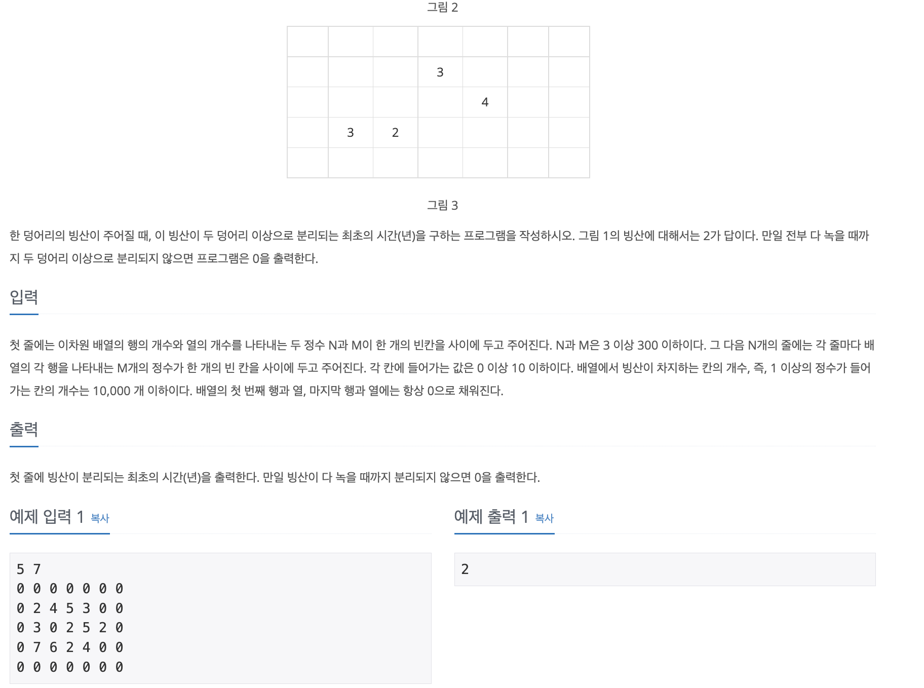 void solution(){ // 빙산이 분리되는 최초의 시간(년) 출력 (빙산이 다 녹을 때까지 분리되지 않으면 0을 출력)