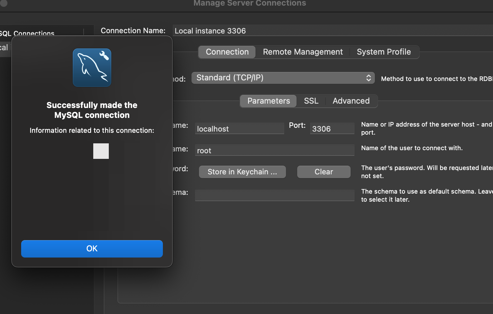 3. store in keychain을 누르고, 비밀번호를 작성한 후, test connection을 누른다.