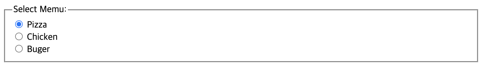 <input type="radio" id="buger" name="menu" value="buger">