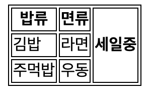 * rowspan, colspan 을 통해 행, 열 병합 가능 (합쳐진 셀들은 태그를 적지 않음)