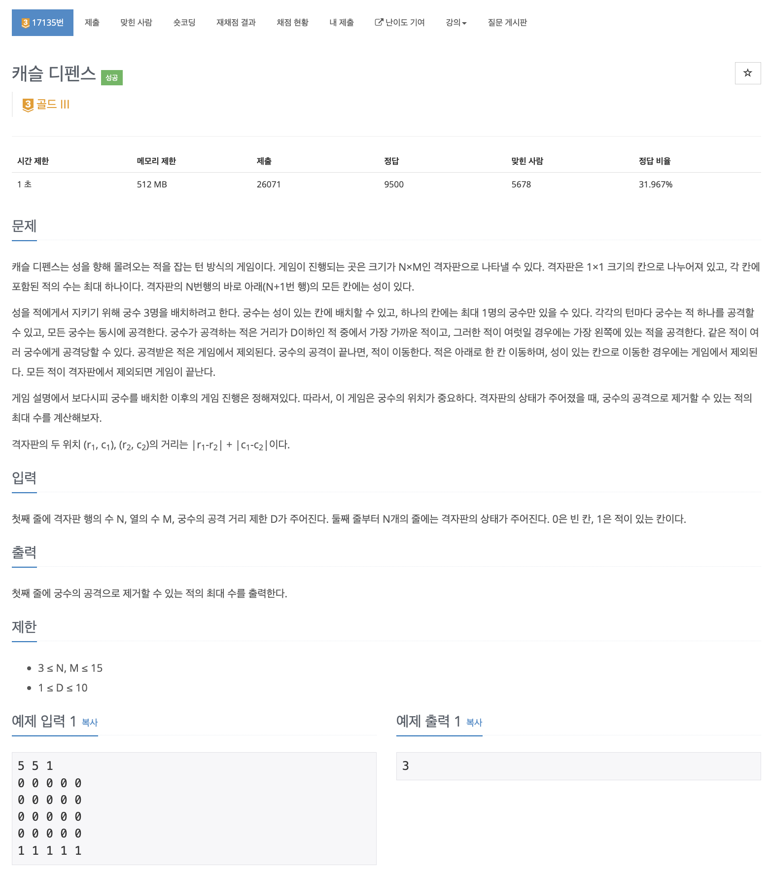 첫째 줄에 격자판 행의 수 N, 열의 수 M, 궁수의 공격 거리 제한 D가 주어진다. 둘째 줄부터 N개의 줄에는 격자판의 상태가 주어진다. 0은 빈 칸, 1은 적이 있는 칸이다.