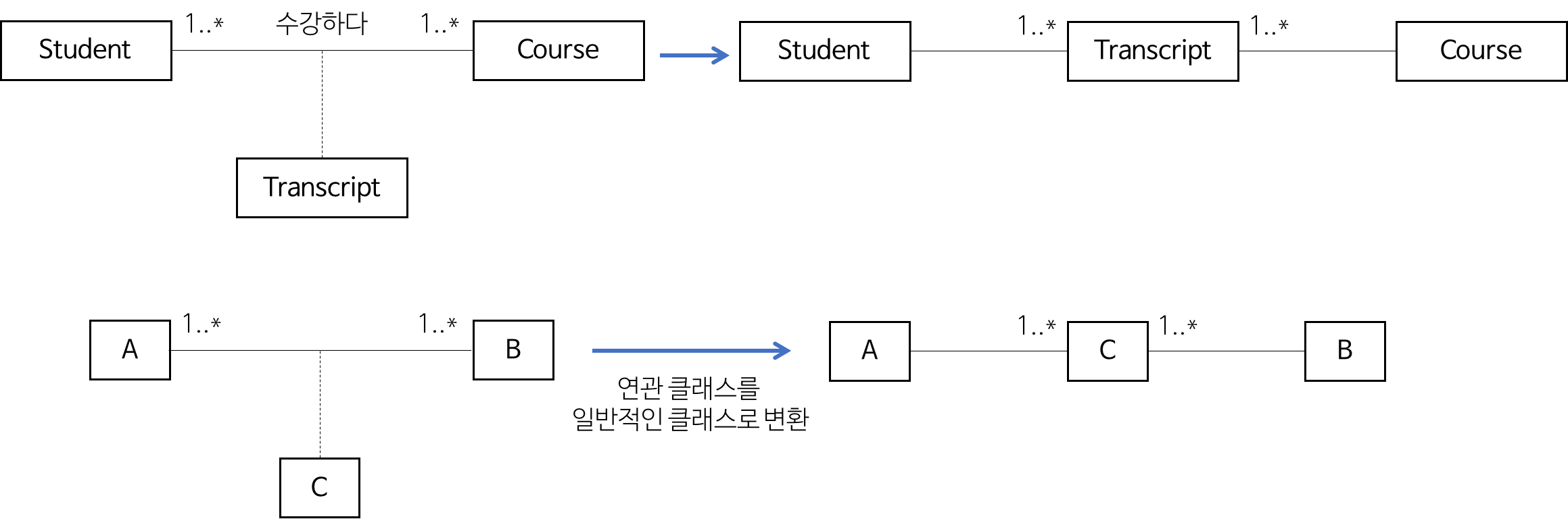💡 연관 클래스 - 연관 관계에 추가할 속성이나 행위가 있는 경우 - 연관 클래스를 일반 클래스로 변환 - 양방향 연관 관계는 구현이 복잡, 보통 다대다 연관 관계를 일대다 단방향 연관 관계로 변환해 구현
