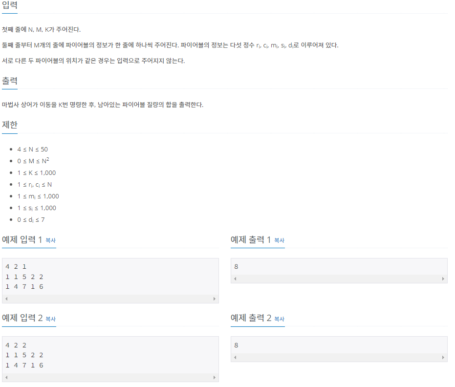 첫째 줄에 N, M, K가 주어진다. 둘째 줄부터 M개의 줄에 파이어볼의 정보가 한 줄에 하나씩 주어진다. 파이어볼의 정보는 다섯 정수 ri, ci, mi, si, di로 이루어져 있다. 서로 다른 두 파이어볼의 위치